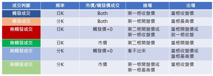 如果您希望用固定邏輯來判斷成交的話,請一律下市價單,這樣就會以 洗價當下 (勾選觸發即成交) 或 下一個價格 (沒有勾選觸發即成交) 來成交。