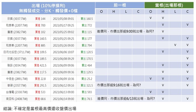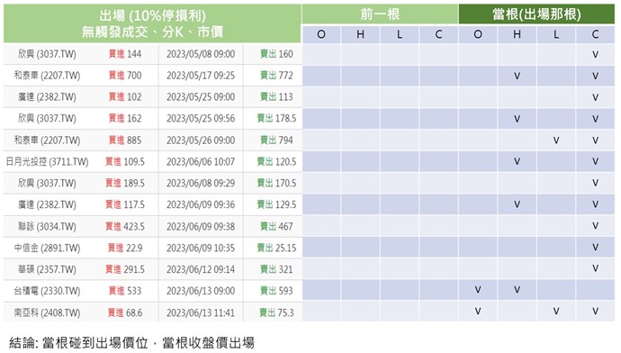 選股出場若是設定停損停利的話,腳本則會在進場後以每分鐘還原的高低來判斷是否停損停利,如果符合的話再判斷還原1分鐘Bar開盤是否符合,符合的話用1分鐘開盤價停損停利,不符合的話用1分鐘收盤價停損停利。