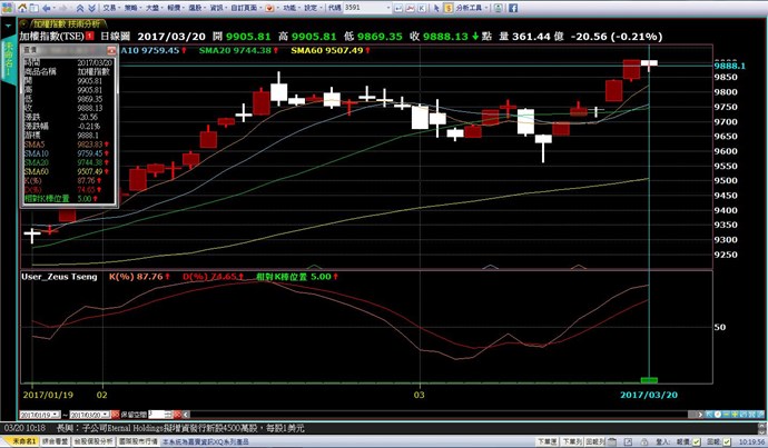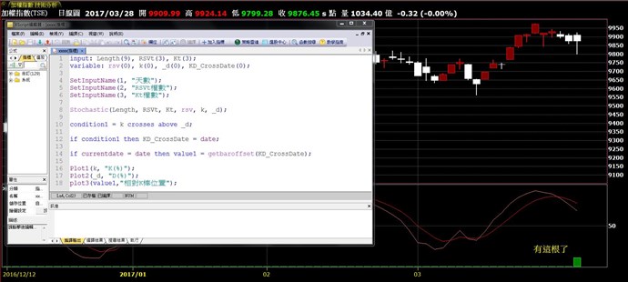我使用自訂指標腳本找出最近KD金叉的相對K棒位置,來當作範例說明。