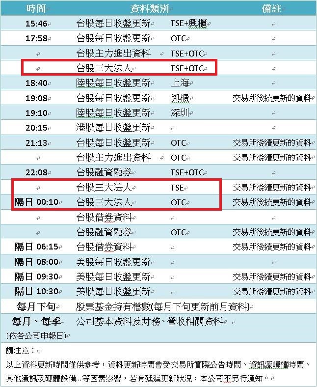關於台股三大法人的盤後資料,官網公布的TSE+OTC 17:58 和TSE 22:08、OTC 00:10
