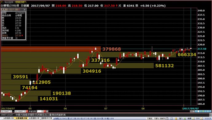 如圖:2017/9/6,股價突破該畫面下的大量成本區