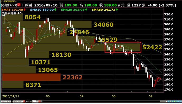 例如下圖 鈊象(3293) 的價量累計圖的畫面,共100根K棒,