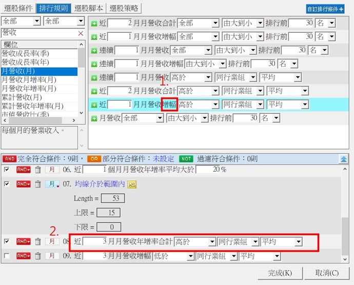 第二個紅框,近3月月營收年增率「合計」高於同行業組平均,這個選項是不是在排行規則中消失了?