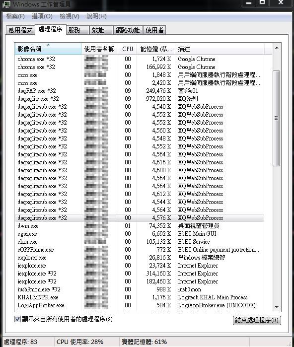 但就算重開了XQ也一樣,"daqxqlitesub.exe*32"一樣攻佔整個工作管理員內容