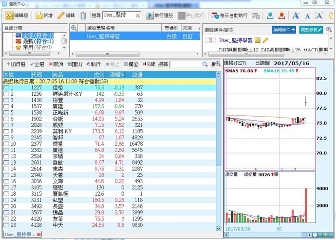 方才執行此選股腳本策略後的選股清單畫面