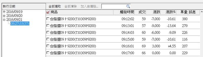 2.執行商品的部分,填入選擇權商品,若是訊號出現時,想找選擇權價格最接近50元的標的來下單