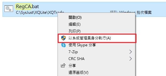 請至「C:\SysJust\XQLite\XQTrade」找到「RegCA.bat」檔案,按右鍵/以系統管理員身份執行。
