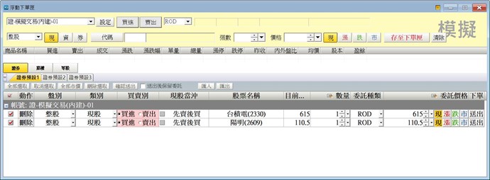 您好,可以使用「下單匣」功能,將由下單列來的單子存放在下單匣之後一次送出。