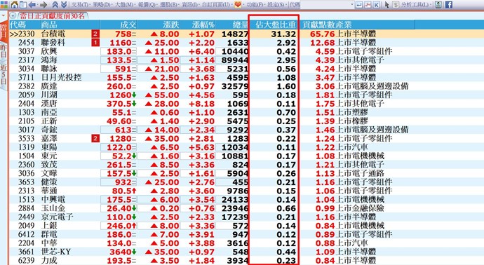 您好,可以參考主選單「大盤」→「個股對加權指數點數影響」頁面,其中的“佔大盤比重“欄位。