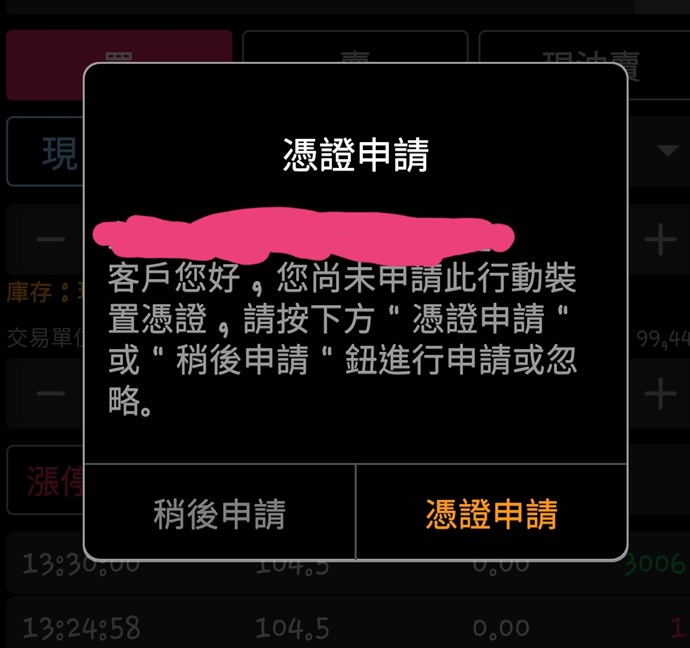 要下單時會出現錯誤訊息如下圖,但是在帳號頁面顯示憑證已經匯入。