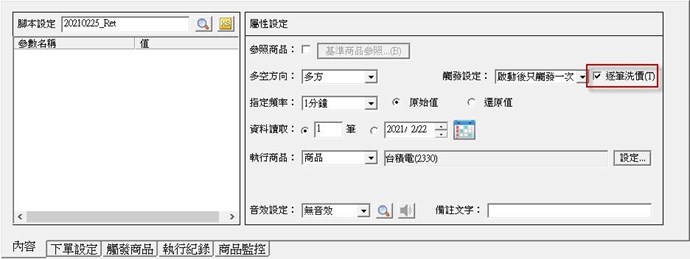關於逐筆洗價的功能介紹,可以參考「進階篇: 觸發設定方式的應用」有相關介紹。