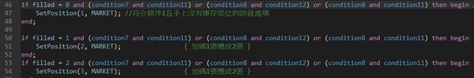 所以只要 condition8 and condition12 或是 condition8 and condition11 符合的話,setposition(1, market) 也會執行。