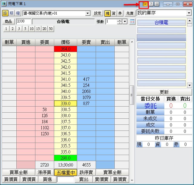 另外有關所述「有些閃電下單夾打開後會跑不見」,在閃電下單標題列的「圖釘」按扭是提供閃電下單視窗的置頂功能(預設是按下狀態),不知是否有誤取消,導致視窗沈到下方,會有不見的感覺。