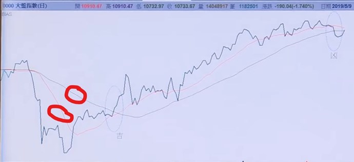 乖離率的移動平均數呢,如圖示中兩條較為平滑的BIAS