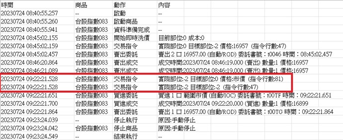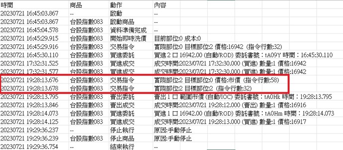 可否幫我看一起哪裡錯誤,導致同時觸發兩個指令,之前程式交易並未出現類似問題,謝謝!