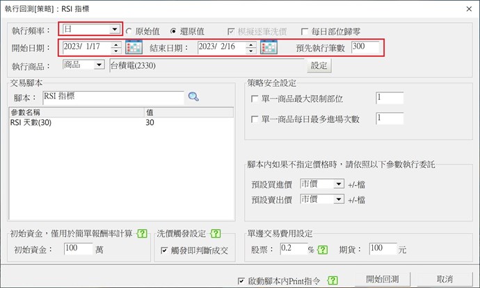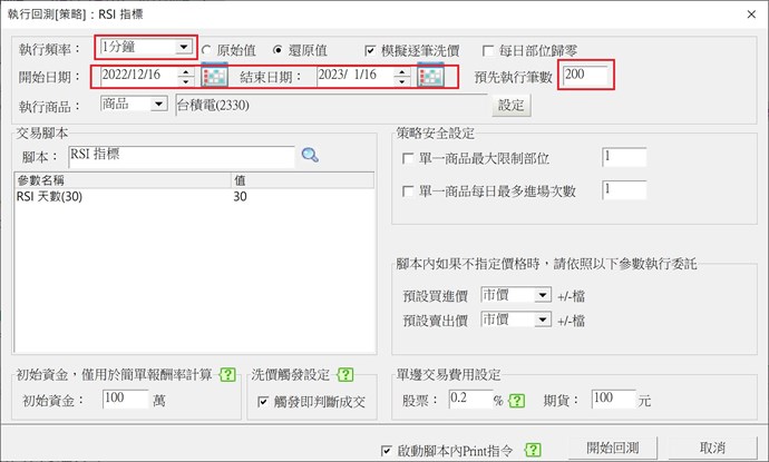 回測的設定為執行頻率: 1 分鐘,日期區間: 2022/12/16 ~ 2023/01/16,預先執行比數為 200,設定畫面如下: