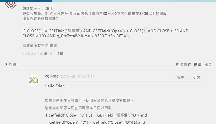 Q3:我在執行交易時後 想判斷昨天這檔股票是否有漲停,於是我參考版上的回復
