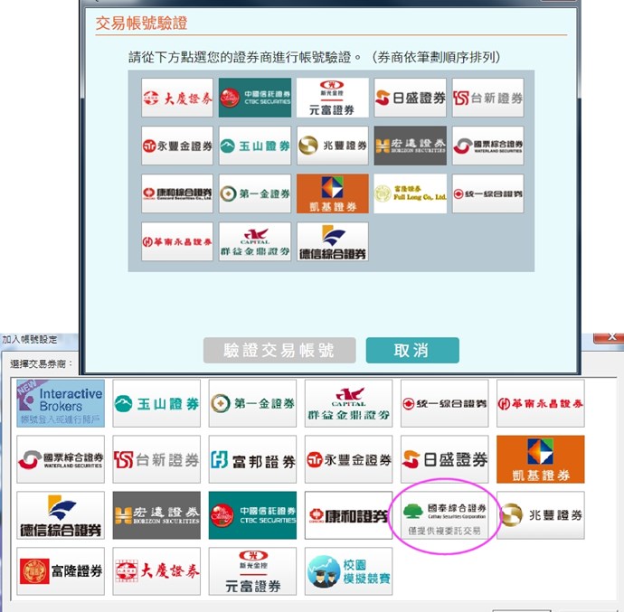 因此在支援台股即時行情的「交易帳號驗證」項目內沒有國泰.