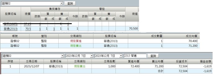 有一股票庫存一張74.4,今日賣出一張71.2再買進一張70.4,結果已實現損益是-1619