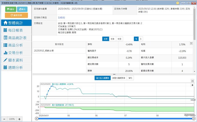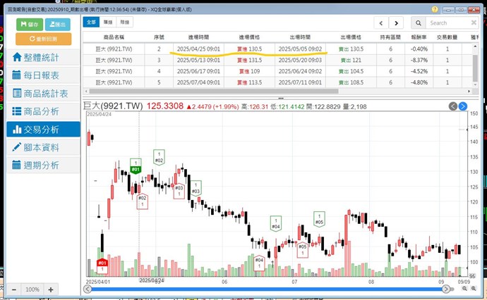 我用下列交易程式測試 巨大 ,外資買賣超>300 就買,期數 5 期就賣,但 下面這筆不是為何?