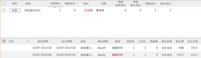 10:12:38.713 波若威(3163) 賣出成交,所以【庫獲利後賣出】交易指令在此刻成交