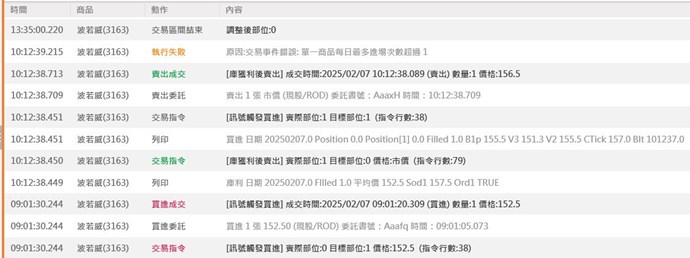 10:12:38.450 波若威(3163) 送出【庫獲利後賣出】交易指令(指令行數 79)此時「實際部位:1、目標部位:0」
