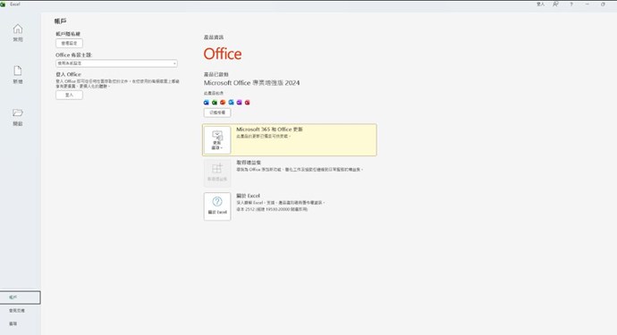 請您到EXCEL > 檔案 > 帳戶 > 關於EXCEL,確認版本是否為 2512以上;