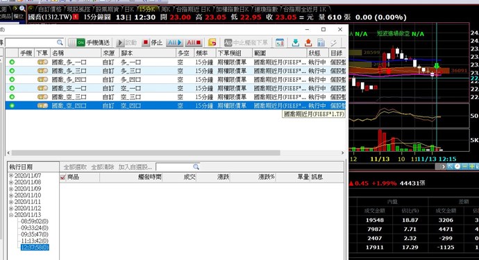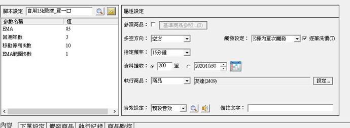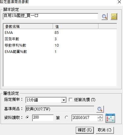 此XS腳本使用在現股上可以即時觸發沒有問題(如附圖,以友達為例),但同一腳本改到 "基準參照商品" 裡(如附圖,以欣興為例),在跳出警示的時間就會慢一根K,例如正常應該在9:15分跳出,但卻在9:30才跳出。