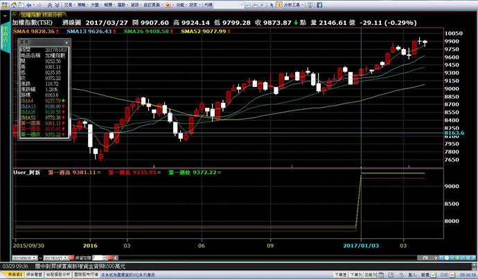 使用指標腳本撰寫一年當中第一根週線K棒的高、低、收來當作範例說明,