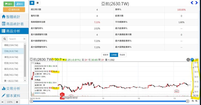 商品分析中的線圖目前會顯示第一檔商品的資訊,不過交易分析的部分是正常的。