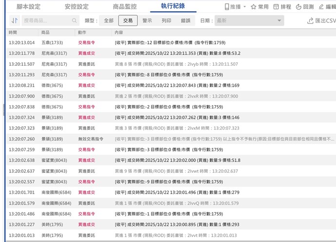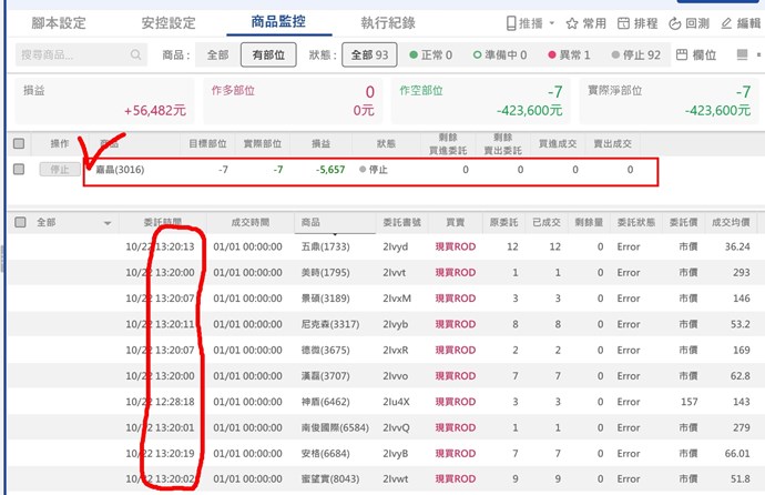 If MKP=-1 and Filled<0 then begin If time>=132000 then begin MKP=0; SetPosition(0, market,label:="收平"); End; //------------------(設定為逐筆洗價+自動洗價) 但是為什麼有部分當沖個股沒生成回補交易指令 而到收盤還是庫存(3016 -7張)
