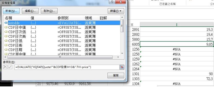 由於DDE全部台股的即時價格電腦負擔太大,excel無法運作,改以上圖中EVALUATE函數來達成初步篩選標的的即時股價,但發現:1.部分股價無法顯示 2.未如DDE般能即時更新。請問有解決方法嗎?或有類似功能可解決???謝謝