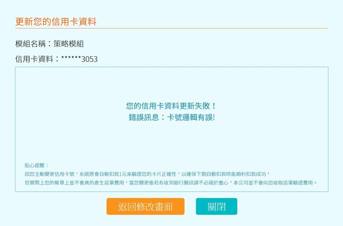 我有購買策略模組, 但是因為信用卡更換, 需要更新信用卡資訊