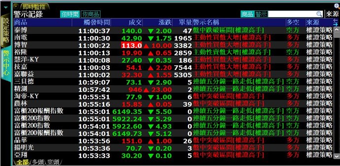 若要達成您的需求,需要寫XS程式,並購買策略模組,因為您的程式內容需要去抓各個頻率的資料,然後寫在同一個策略腳本做判斷。但是像下方圖片一樣,要觸發才會顯示上去,沒辦法像您所敘述,跑的策略都列在那裡,觸發了就反白。