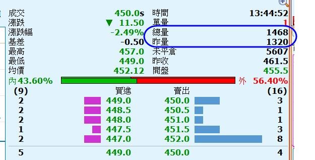 例如台積電期,報價欄的總量顯示1468,但是明細欄是502。