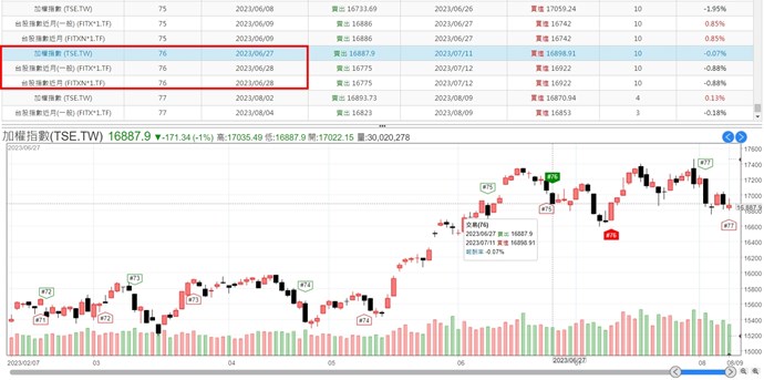 不過目前遇到實務上的回測問題是,在加權指數商品上沒問題,的確可以當天收盤價進場,但在台指期卻會慢一天收盤價才進場。