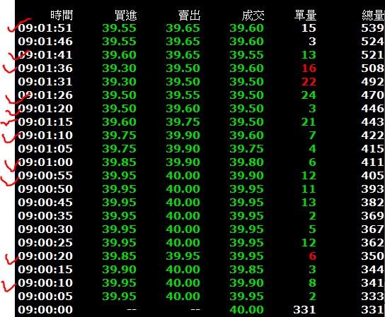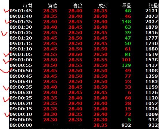 1、每一筆成交記錄,都會有「交易時間、買進、賣出、成交、單量、 總量」