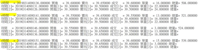 print("時間=",time,"買進=",q_Bid,"賣出=",q_Ask,"成交=",close,"單量=",volume,"總量=",q_DailyVolume);