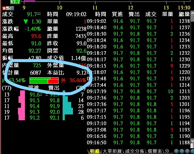 您好,關於內外盤量之比:紅色代表外盤量的比率,綠色代表內盤量的比率。