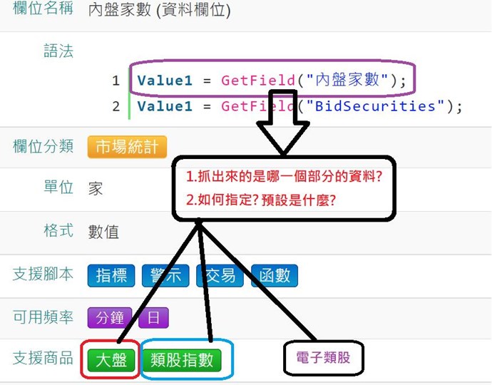像是 GetSymbolField("TSE.TW", "內盤家數")。