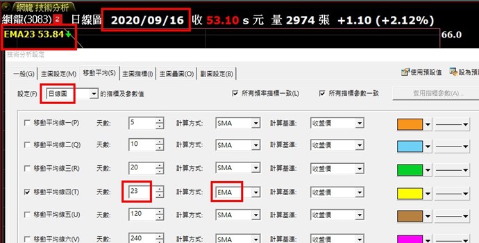 下圖是使用內建的EMA指標,同一天同一檔股票,都是日K,結果數值會不同