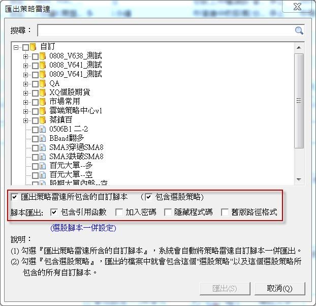 1. 策略雷達匯出檔,記得勾選"匯出策略雷達所包含的自訂腳本與選股腳本",如下圖