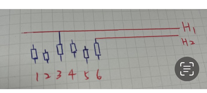 K棒3出現盤高過一高,觸發價為H1。之後有K棒高點大於H1即觸發。 K棒6重新出現一次盤高過一高,觸發價下調成H2.