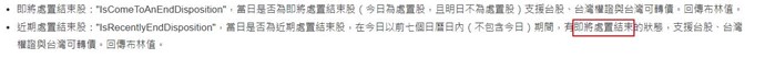 近期處置結束股:"IsRecentlyEndDisposition",當日是否為近期處置結束股,在今日以前七個日曆日內(不包含今日)期間,有即將處置結束的狀態,支援台股、台灣權證與台灣可轉債。回傳布林值。
