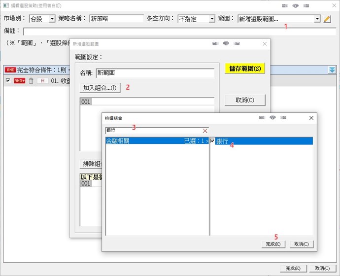 如果使用選股,可以指定「範圍」(見下圖標示 1~5),就可以限縮在「銀行」的個股,再搭配您自己編寫的程式策略,或許能解決您的問題,供您參考~