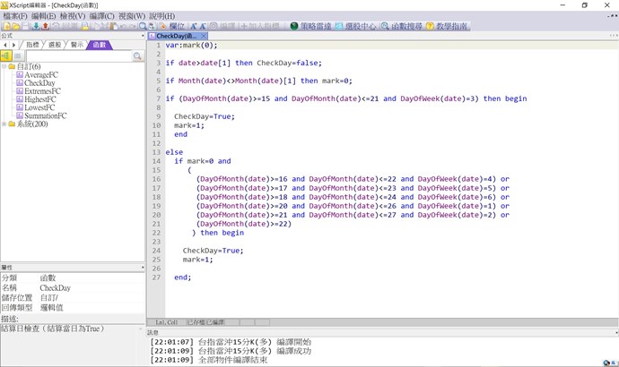 想於警示當中跑資料,寫入判斷當日是否結算日(第三個星期三),我希望在屬於該月第三個星期三的時候,就在v83這個欄位標記1,預設為0。