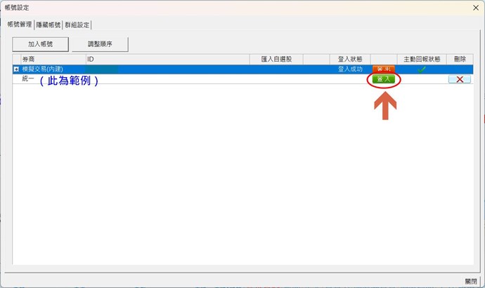 ※在使用XQ新帳號登入後,請確認您功能表的【交易→帳號設定】,是否有原券商帳號,若狀態是登出,請點按一次變成“登入”即可。