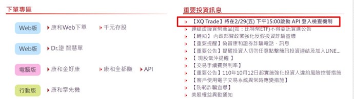 經與康和證券確認,因有可能是有簽了API風險預告書,但無"測試記錄",故在XQ登入會有錯誤訊息無法使用,需麻煩洽康和營業員或康和客服。