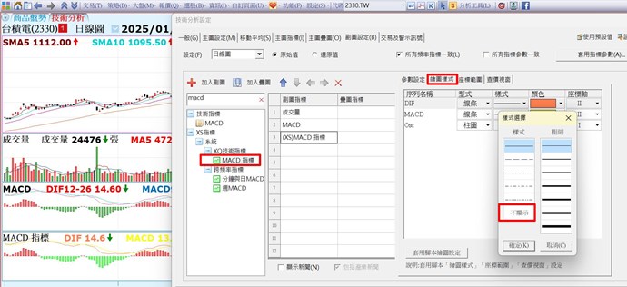 如MACD的快、慢線,可勾選顯示或隱藏。