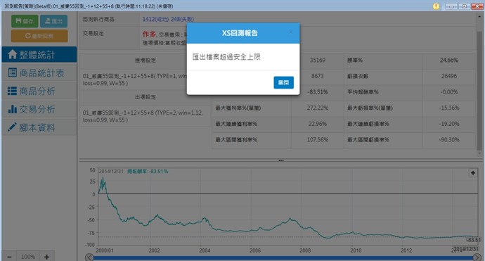 您好,回測報告匯出成Excel檔時,超過 150M 以上,則會跳出安全限制的警示視窗,而無法匯出,